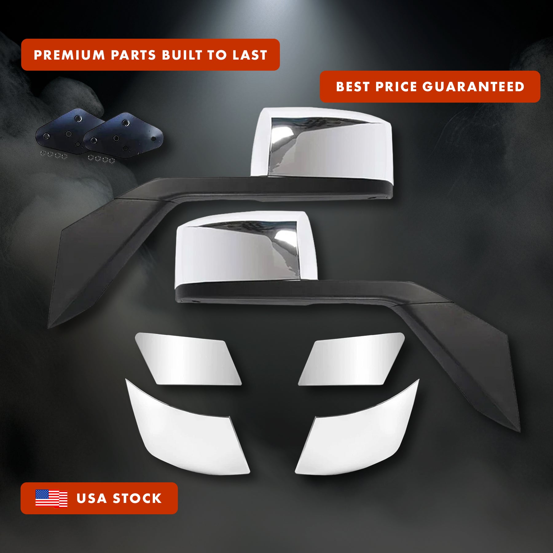 - Comes with Logo, Frame License Plate, 2x 22" Windshield Wipers, Fender Chrome Trim set, Bumper Corners Chrome Trim Set and Vest