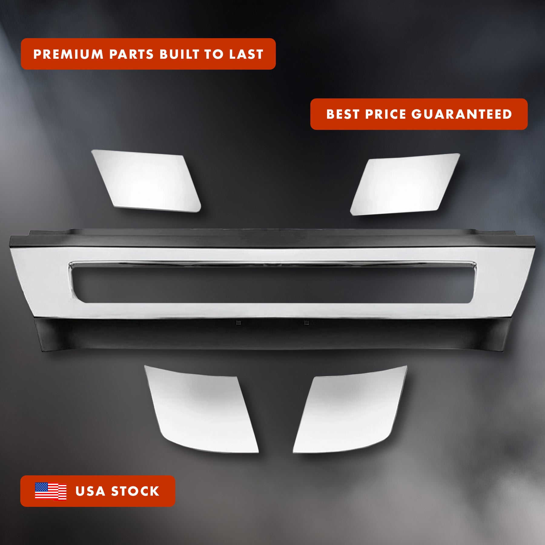 • The set includes: Replacement Center Bumper, Center Bumper Chrome Strip, Chrome Trim Set (Left and Right Side), Behind the Headlight Chrome Trim Set (Left and Right Side)