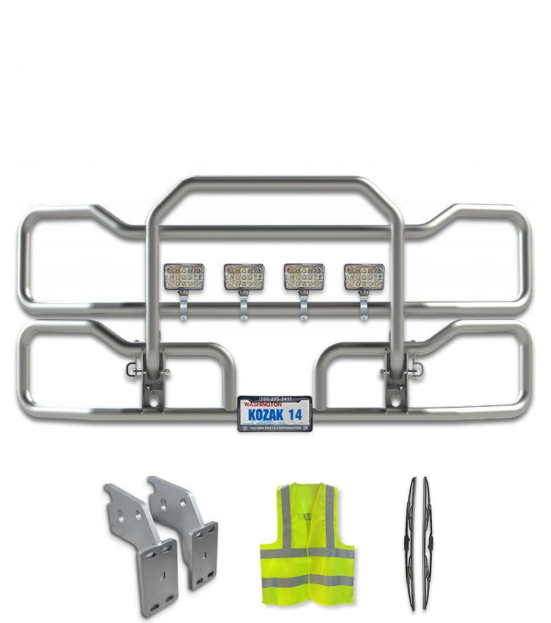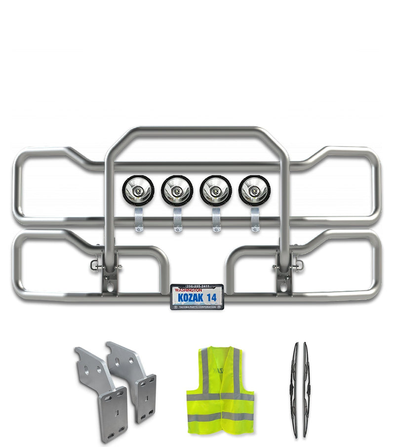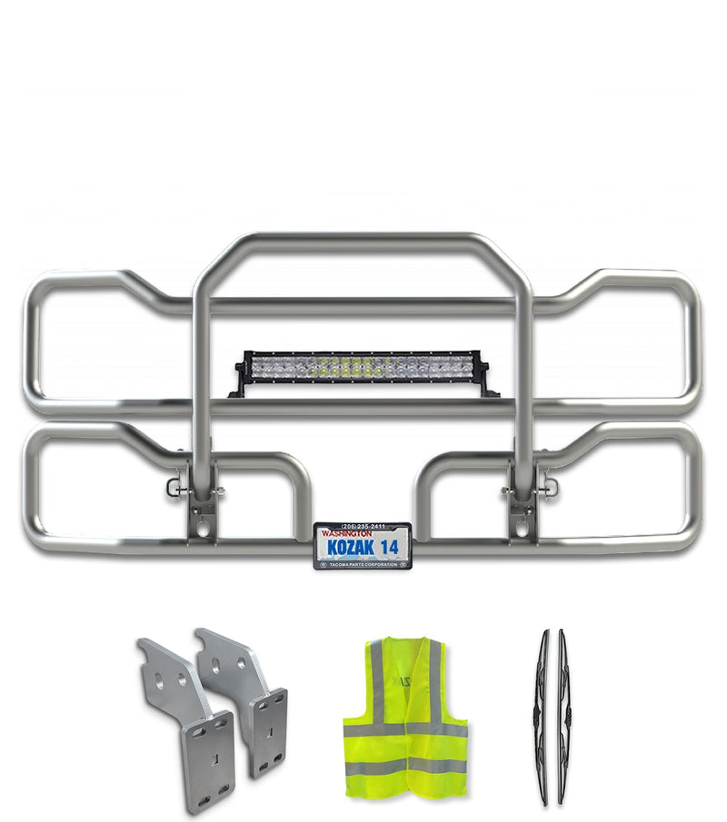 - This listing includes 1x Grille Guard with your choice of lights, Mounting Brackets, 1x License Plate Holder, 1x License Plate Frame, 2x 22" Windshield Wipers and Reflective Vest