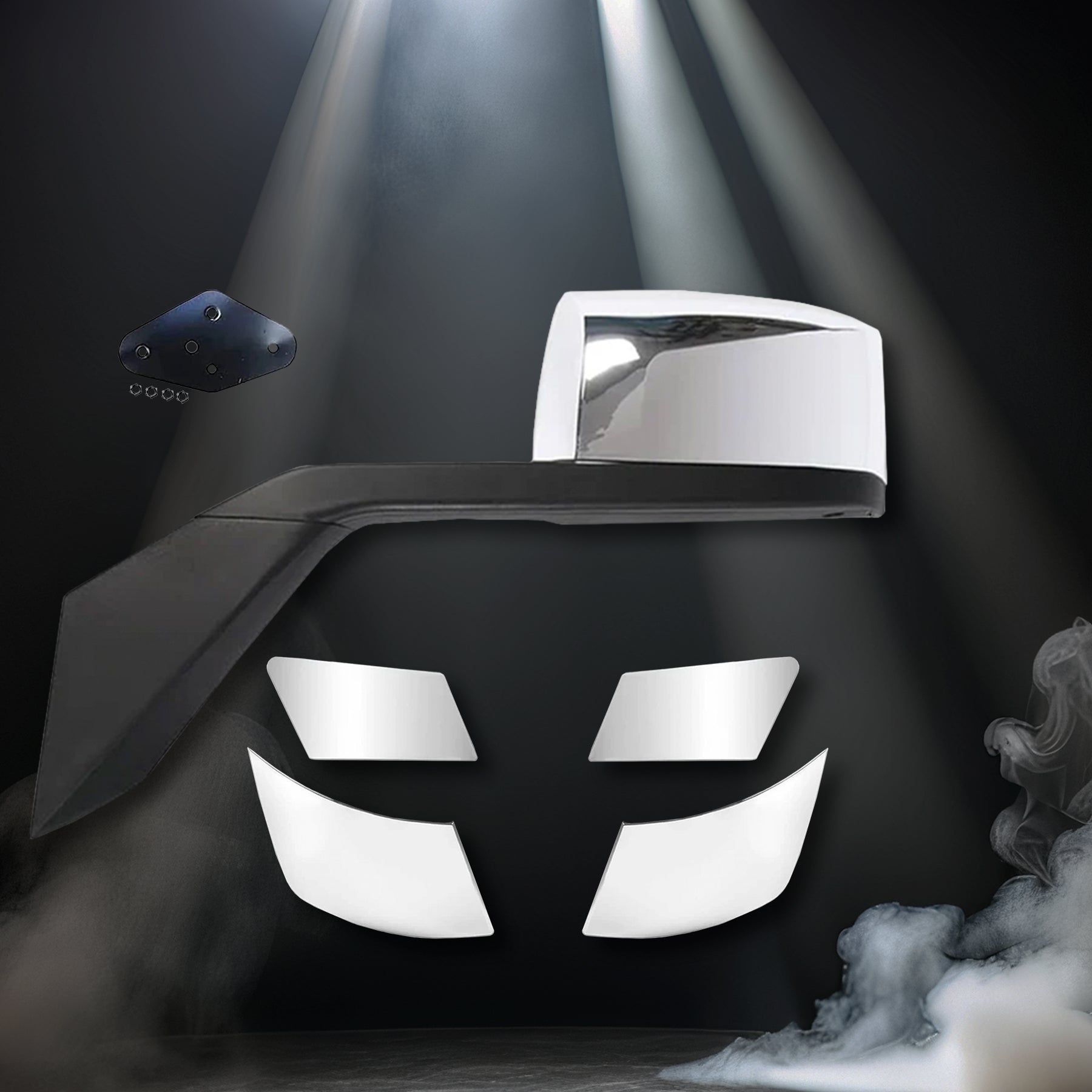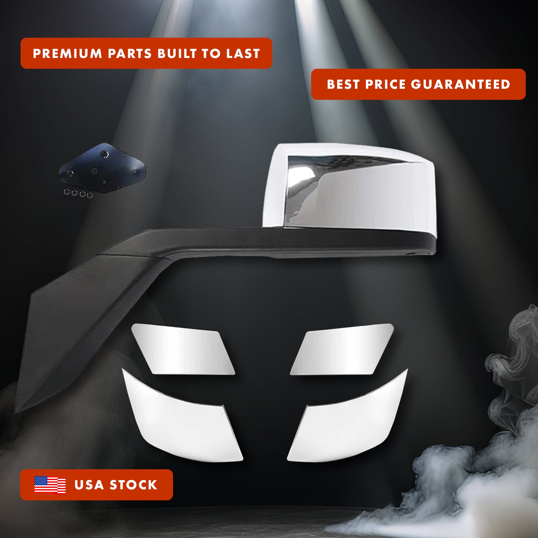 - Comes with Logo, Frame License Plate, 2x 22" Windshield Wipers, Fender Chrome Trim set, Bumper Corners Chrome Trim Set and Vest