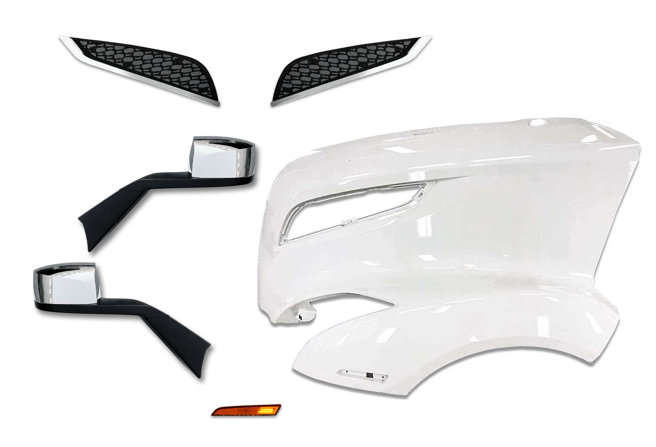 • Include Chrome Hood Mirrors Pair, Air Hood Vents Grille Set (Driver Left and Passenger Right Side) and Turn Marker Light